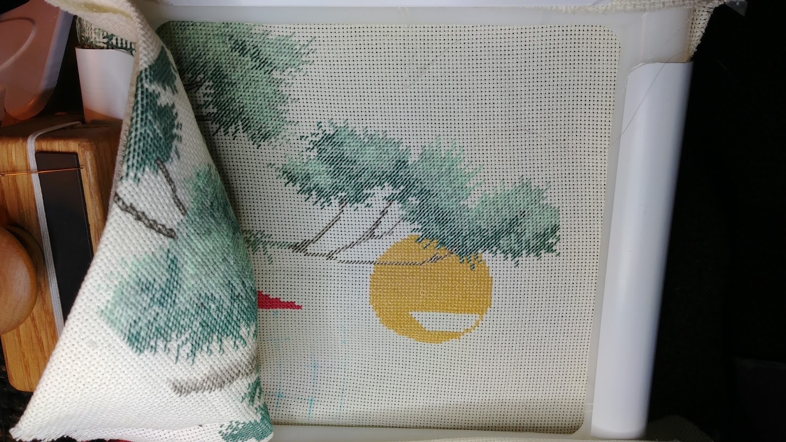 I'm finding numerous errors as I go but it looks fine to me so I won't be ripping anything out. Once I finish the sun and get the backstitching on the branches, I plan to continue on the Samurai proper. Working with all those pretty colors will be a cheering task.